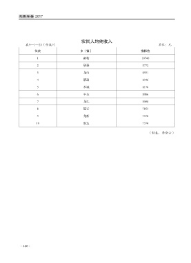 龙陵年鉴 2017 农民人均纯收入 表9—1—23(分表9) 单位:元 位次 乡(镇) 指标值 1 勐糯 10740 2 碧寨 8772 3 龙山 8591 4 腊勐 8346 5 木城 8176 6 平达 8086 7 龙江 8004 8 镇安 7853 9 龙新 7378 10 象达 7374 (制表:李金山) ·440·