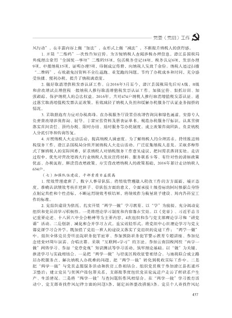 居办税服务点,解决纳税人办税难的问题,把“两学一做”转化到税收实际工作中。二是