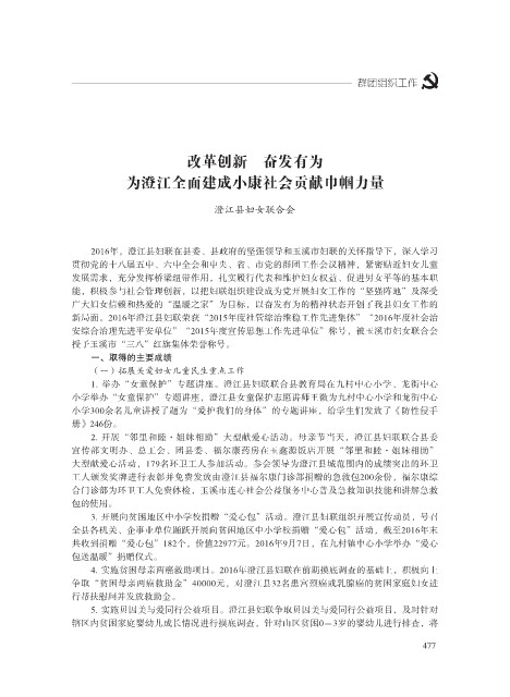 新局面。2016年澄江县妇联荣获“2015年度社管综治维稳工作先进集体”“2016年度社会治