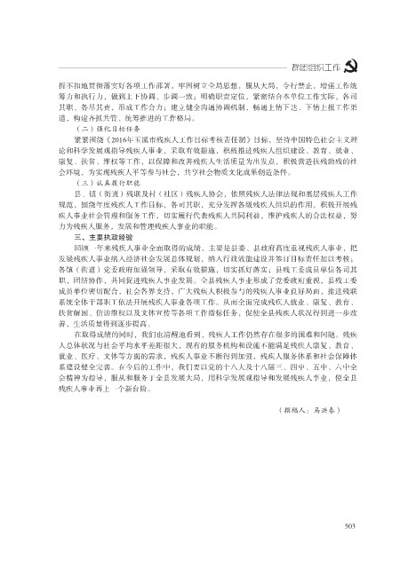 规范,围绕年度残疾人工作目标,各司其职,充分发挥各级残疾人组织的作用,积极开展残