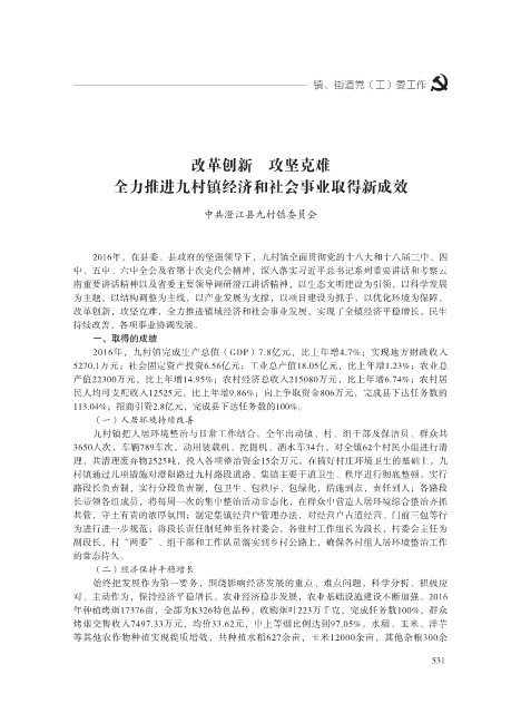 2016年,九村镇完成生产总值(GDP)7.8亿元,比上年增4.7%;实现地方财政收入