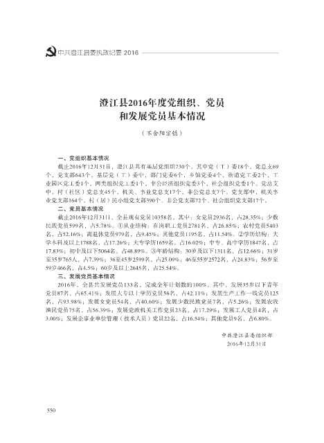 截止2016年12月31日,澄江县共有基层党组织730个。其中党(工)委18个,党总支69