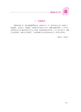 群团组织工作 三、经验体会 要做好文联工作,就必须紧紧围绕县委、政府的中心工作,服务好全县大局,积极参与、 强化服务、主动作为、开拓创新,贯彻落实好党的文艺方针,脚踏实地搞好创作,广泛争取、 团结和动员社会力量共同参与文学艺术事业,加强和改进协会管理,丰富文艺活动形式,鼓励 文艺精品创作,提高文艺刊物质量,以高素质的文艺队伍推动全县文艺工作的百花齐放。 (撰稿人:张国仙) ·433·