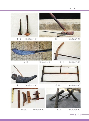 附 录 凿 子 (王丕余2015年摄) 锛 (苏建修2012年摄) 弯 刀 (王文德2012年摄) 偏 斧 (王丕余2015年摄) 墨 斗 (王丕余2015年摄) 手 锯 (王丕余2015年摄) 木匠工具 (施学文2013年摄) 木 马 (苏建修2012年摄) 【 547 】