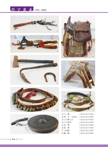 昌宁县志 1978~2005 ① ② ⑥ ③ ⑦ ④ ⑧ ① 马 鞭 (施学文2013年摄) ② 辔 头(马笼头)(施学文2013年摄) ③ 上马掌工具 (施学文2013年摄) ④ 小马串铃 (施学文2013年摄) ⑤ 铓 锣 (施学文2013年摄) ⑥ 鞍 韂 (施学文2013年摄) ⑦ 马鞍架 (施学文2013年摄) ⑤ ⑧ 攀 胸 (施学文2013年摄) 【 548 】