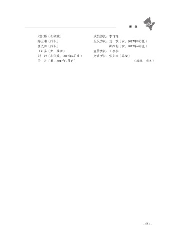附 录 刘红雁(布依族) 武装部长:李飞艳 陈云书(挂职) 组织委员:刘 敏(女,2017年8月任) 张光灿(挂职) 邵姝莉(女,2017年4月止) 王红芬(女,挂职) 宣传委员:王思泰 刘 超(布依族,2017年4月止) 财政所长:张文生(非党) 吴 冲(兼,2017年9月止) (撰稿 周杰) - 551 -
